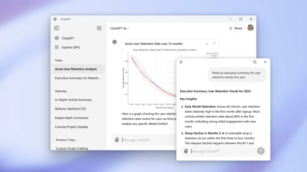 To start a new ChatGPT chat, simply use the Alt + Space keyboard shortcut after installing the app. You may ask ChatGPT questions, have it analyze photos, and upload files, among other basic functions. The desktop software has access to the most recent AI models from OpenAI. Nevertheless, according to the OpenAI support page for its Windows software, the Windows app still lacks a few functions that are present in the Mac and web versions.